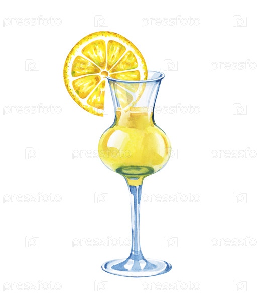 Ручно окрашенный ликер Limoncello в стакане с желтым куском лимона.Акварельная иллюстрация на изолированном фоне