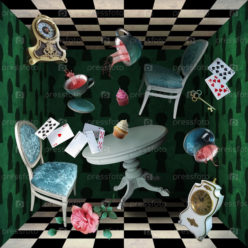 Комната мира чудес.Летающая мебель, игровые карты, чаши, часы, ключи и многое другое на фоне зеленых стен и шахматного пола. Безумная чайная вечеринка. Красочный фон для фотосессий и вечеринок