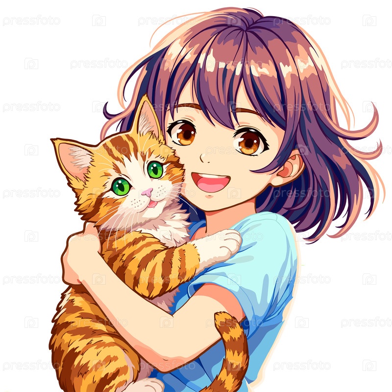 Милый момент: Девушка в стиле аниме обнимает кошку