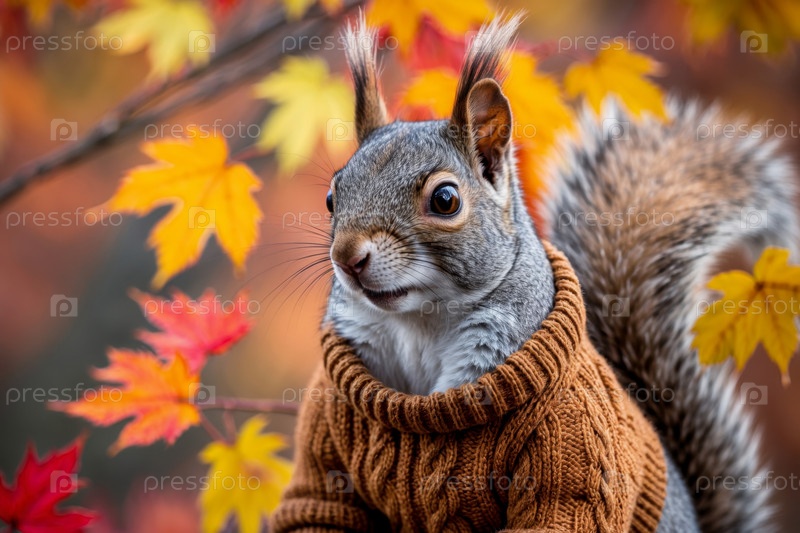 AI Generative Белок в трикотажном свитере на осеннем лесном фоне, животное в красно-желтых листьях