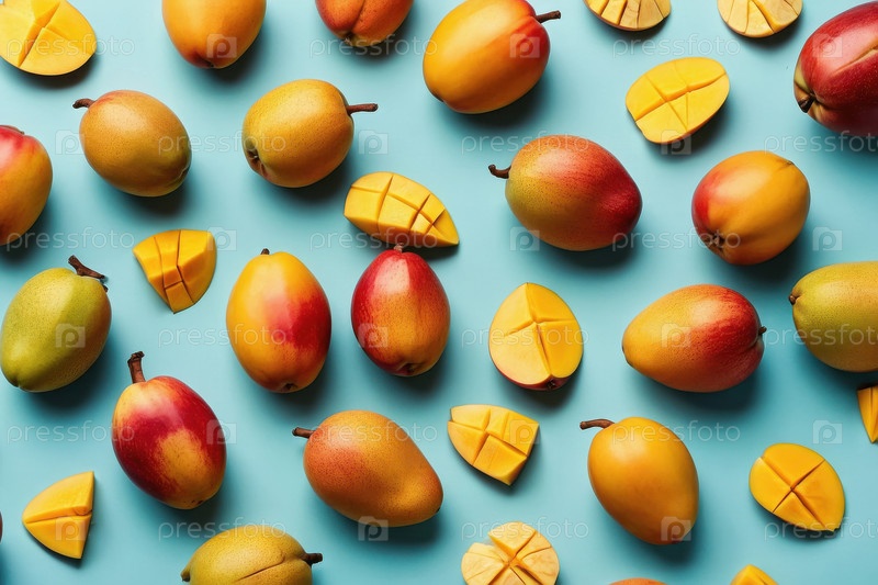 AI Generative Flat lay pattern of ripe mango fruits, top view on summer organic fresh background (Генеративный искусственный образец плоского слоя спелых манговых фруктов, верхний вид на летнем органическом свежем фоне)
