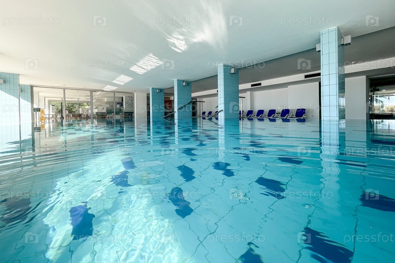 Внутри крытого бассейна с голубой водой на заднем дворе загородного коттеджа