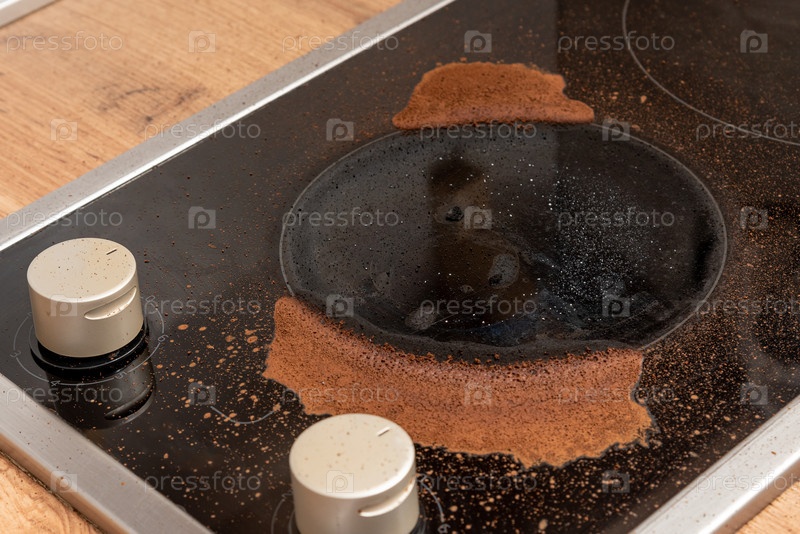 Кофе сбежал из тюрка-цезве, кофеинная сажа на кухонной плите, инцидент приготовления пищи