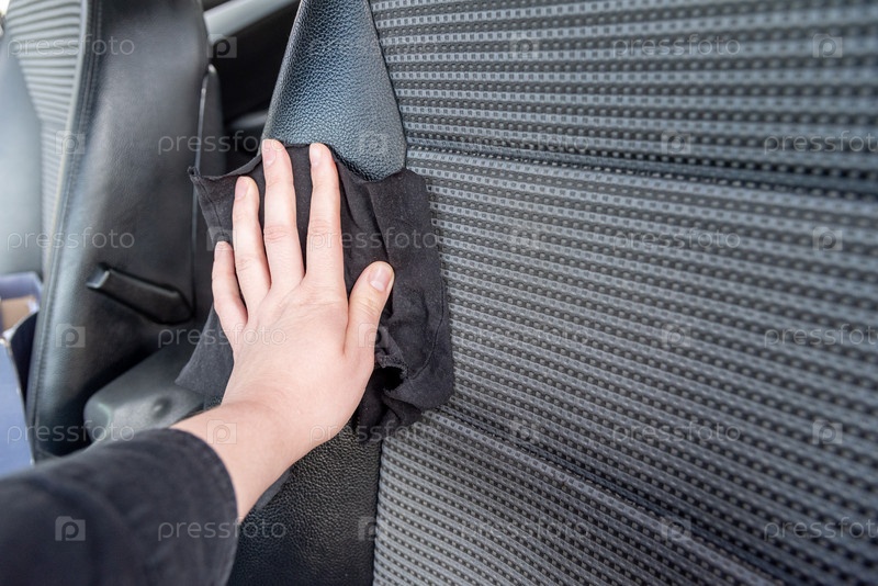 Близкий снимок ручного рабочего механика полировки очистки черного кожаного автомобильного интерьера с тряпкой и профессиональным лак-воском