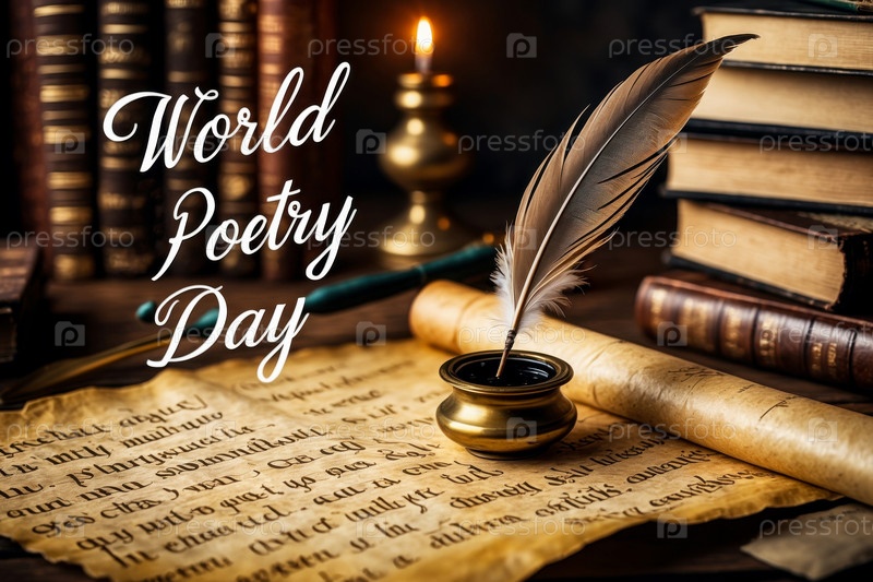 Поздравительная открытка с международным праздником Всемирный день поэзии с чернилами и ручкой AI Generative