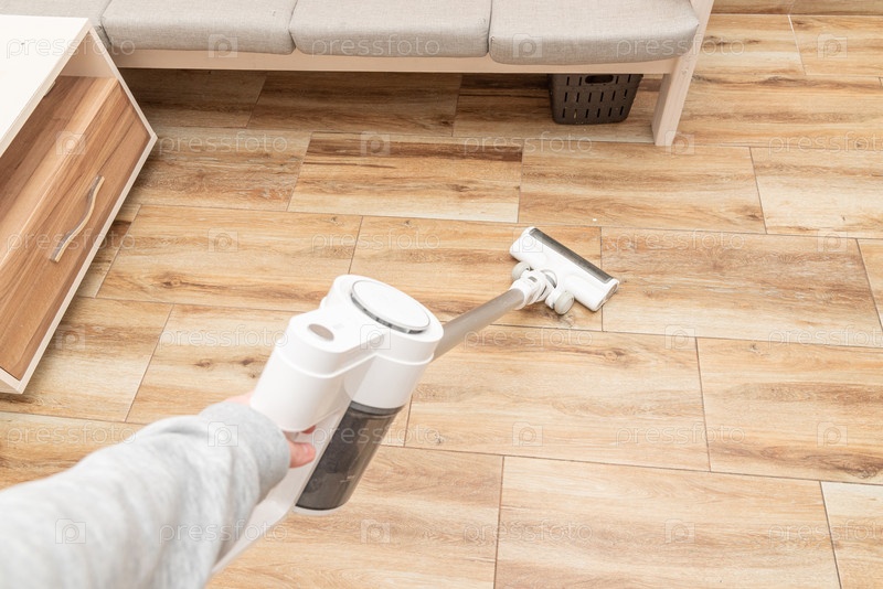 Человек пылесосит пол портативный вертикальный беспроводной чистильщик, рутинная домашняя уборка