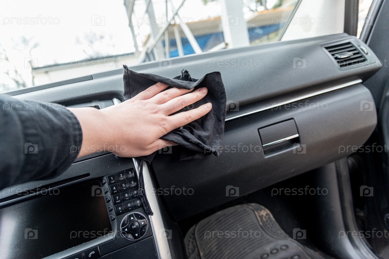 Близкий снимок ручного рабочего механика полировки очистки черного кожаного автомобильного интерьера с тряпкой и профессиональным лак-воском