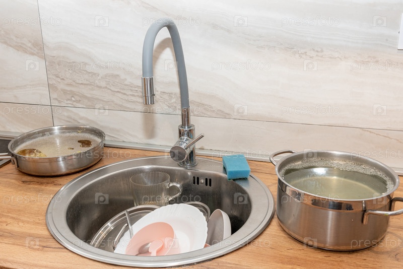 Куча грязной посуды в раковине, концепция невыполненных домашних обязанностей и беспорядка