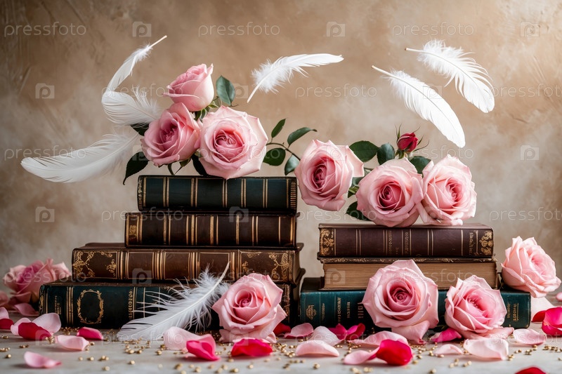 Натурм старых книг, розовые розы и письмо с перьями, фон Всемирный день поэзии AI Generative
