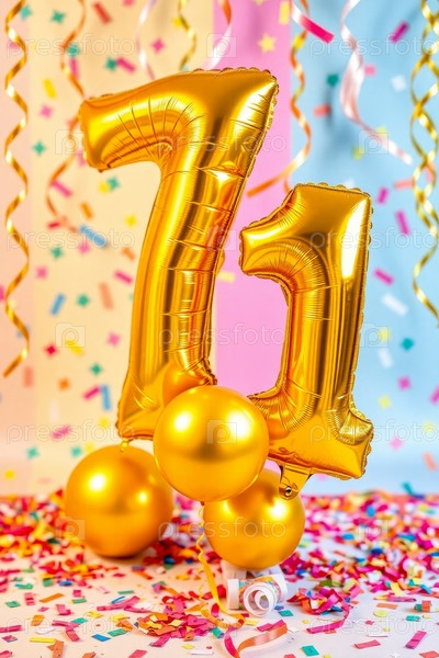 Гелиевый баллон на день рождения номер семьдесят один, фигура из золотых букв 71 праздник праздничный фон