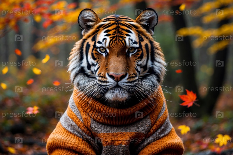 AI Generative Тигровый кот в трикотажном свитере на осеннем лесном фоне, животное в красно-желтых листьях