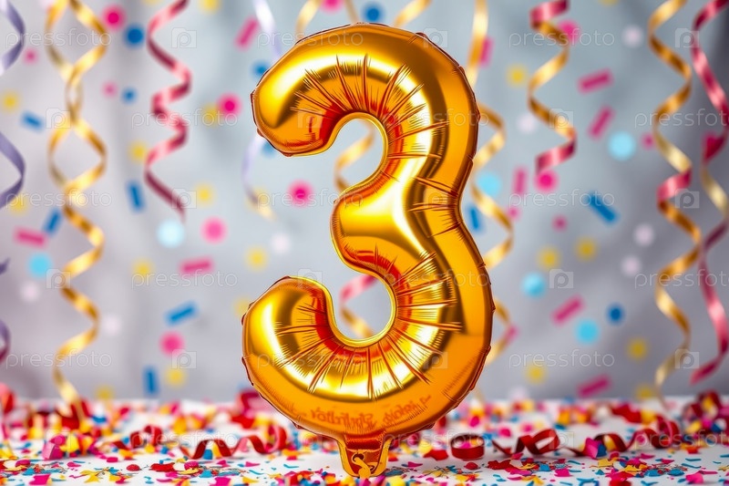 Гелиевый баллон рождения формы номер три, фигура золотой буквы 3 на праздновании праздничный фон
