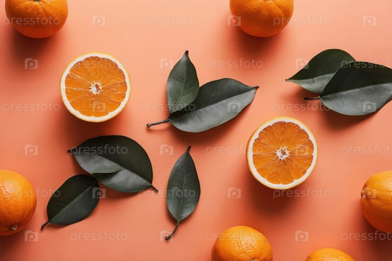 Плоский укладный рисунок спелых апельсиновых фруктов, верхний вид на лето органический свежий фон AI Generative