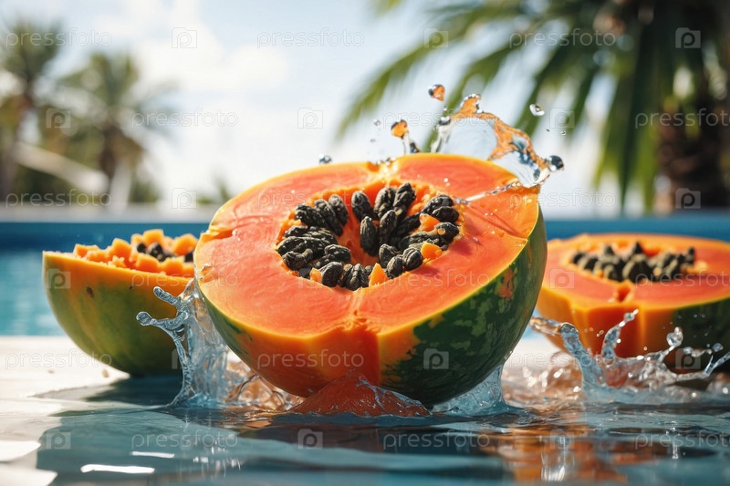 AI Generative Экзотические фруктовые папайи в брызгах воды на летнем бассейне отдых фоном