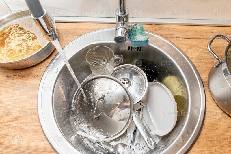 Куча грязной посуды в раковине, концепция невыполненных домашних обязанностей и беспорядка