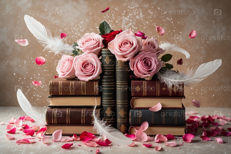 Генеративный натюрморт старых книг, розовые розы и перья для письма на фоне Всемирного дня поэзии AI