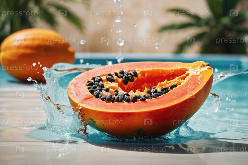 AI Generative Экзотические фруктовые папайи в брызгах воды на летнем бассейне отдых фоном