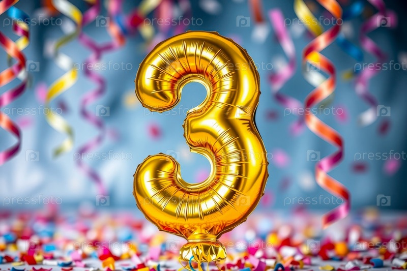 Гелиевый баллон рождения формы номер три, фигура золотой буквы 3 на праздновании праздничный фон