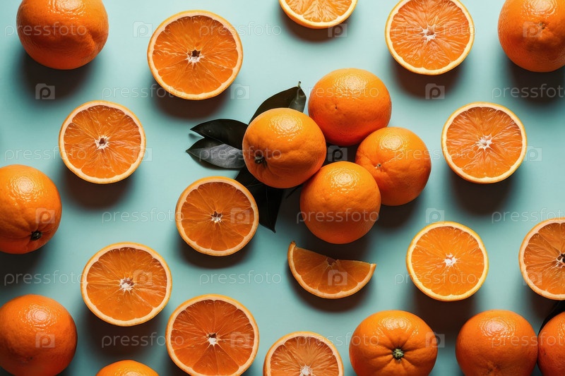 AI Generative Flat lay pattern созревших апельсиновых фруктов, верхний вид на летнем органическом свежем фоне