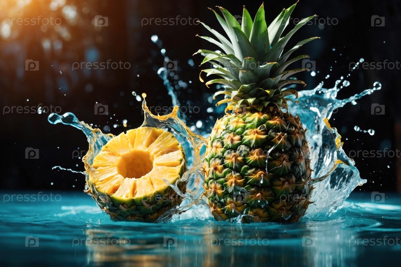 AI Generative Экзотические фрукты ананас в распылении воды на летнем бассейне отдых фоном