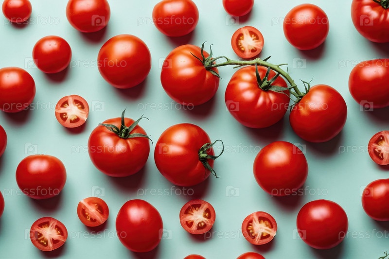 AI Generative Flat lay pattern of ripe tomato vegetable, top view on summer органический свежий фон