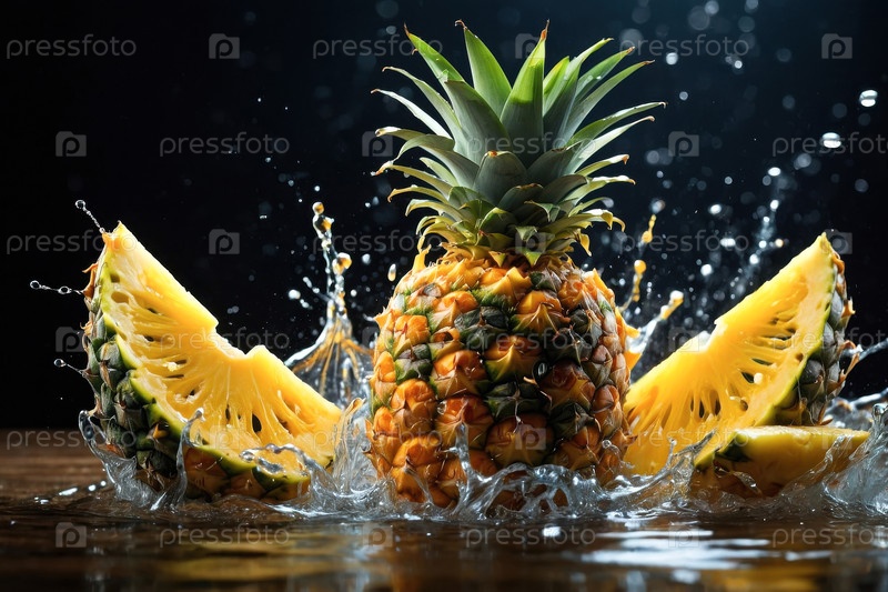 Экзотические фрукты ананас в распылении воды летом бассейн праздничный фон AI Generative