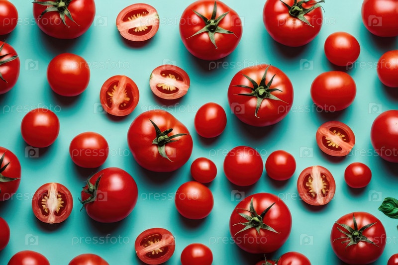 AI Generative Flat lay pattern of ripe tomato vegetable, top view on summer органический свежий фон