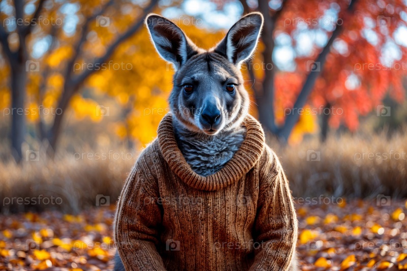 Кенгуру в трикотажном свитере осенний лесный фон, животное в красно-желтых листьях AI Generative