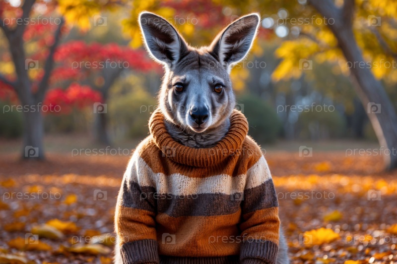 Кенгуру в трикотажном свитере осенний лесный фон, животное в красно-желтых листьях AI Generative