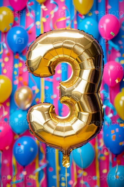 Гелиевый баллон рождения формы номер три, фигура золотой буквы 3 на праздновании праздничный фон