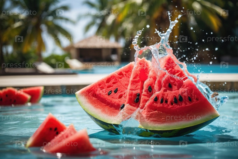 AI Generative Экзотические фрукты капуста в распылении воды на летнем бассейне отдых фоном