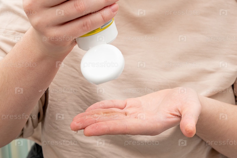 Сжатие лица женщина стирает чистый гель косметический на ее руке женская красота рутина