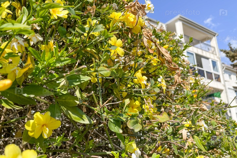 Цветение жасминового дерева деликатное красивое прекрасное желтый цветок весенний сезон вблизи