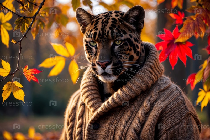 Леопард в трикотажном свитере осенний лесный фон, животное в красно-желтых листьях AI Generative