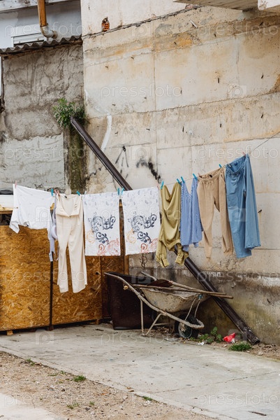 Одежда и полотенца висят на заднем дворе в очереди, высушивая одежду после мытья домашней работы