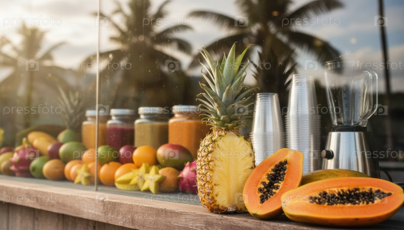 Тропические фрукты и блендеры на стойке для свежих концепций соков, вибрации туристических направлений от Гавайев до Бали и продвижения трендов оздоровления