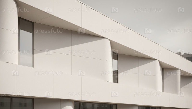 Современный архитектурный фасад с мягкими теплыми белыми панелями, образующими изогнутые минимальные поверхности под бледним нейтральным светом, создает спокойную изысканную структуру со тихим воздушным тоном