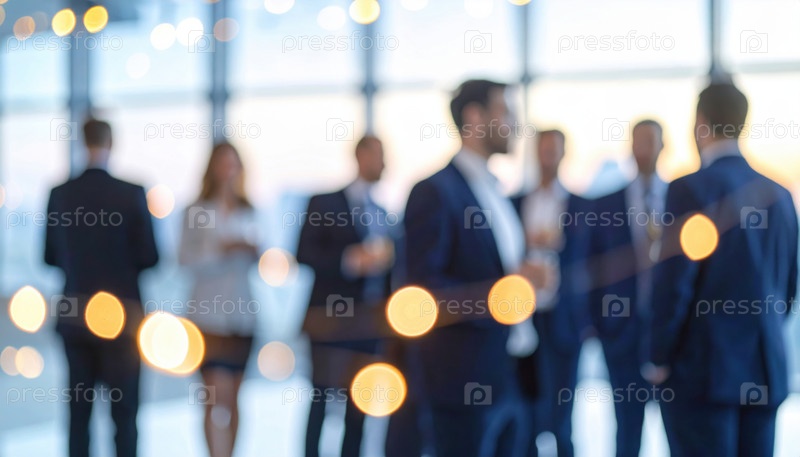 Бизнесмены в формальных костюмах общаются на профессиональном корпоративном гала-мероприятии с эффектом света боке и размытым видом интерьера офиса для фона