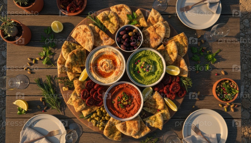 Красочное средиземноморское блюдо из мецзе с оливками и плоским хлебом на деревенском столе, вызывающее расслабленное летнее собрание на открытом воздухе и случайный обмен культурой еды