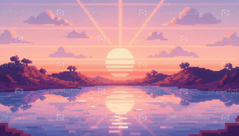 Ретропиксельный художественный пейзаж, изображающий цифровой закат и ностальгическую гейминговую эстетику подходит для креативного брендинга трендов и темы виртуального мира