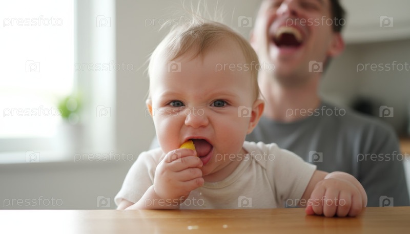 Милый ребенок делает смешное лицо после того, как попробовал кислый лимон в то время как отец смеется на заднем плане празднуя первый День отца вместе в яркой кухне