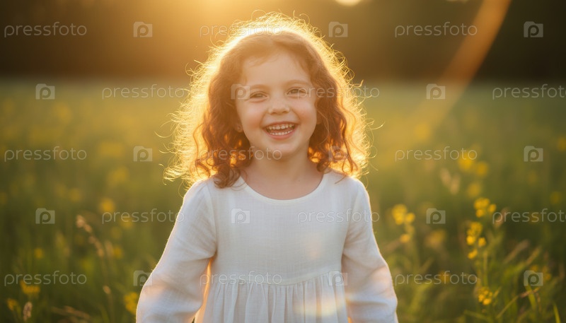 Веселая молодая девушка с кудрявыми волосами смеется на золотом поле во время заката, демонстрируя детскую радость и естественное наружное освещение