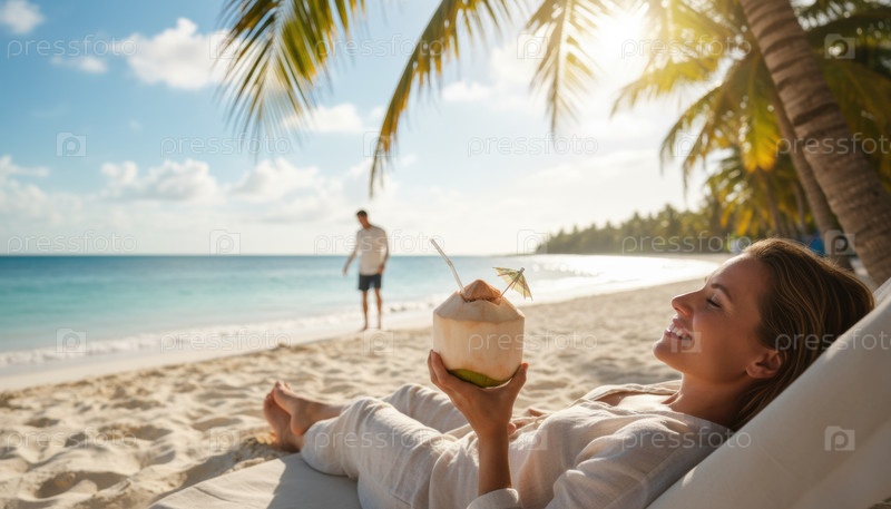 Расслабленная женщина пьет свежий кокосовый орех на тропическом пляже в Мальдивах при восходе солнца