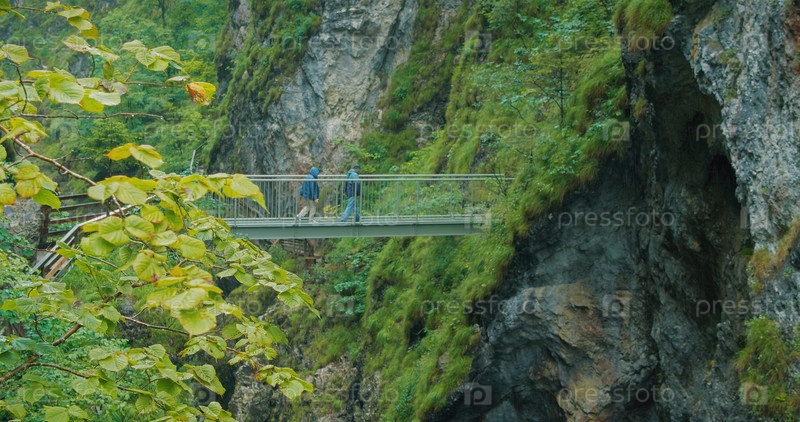 Активная старшая пара ходит в горы в дождливый день. Зрелая женщина и мужчина наслаждаются приключениями. Отставная семья пересекает мост через ущелье в Австрии. Lammerklamm