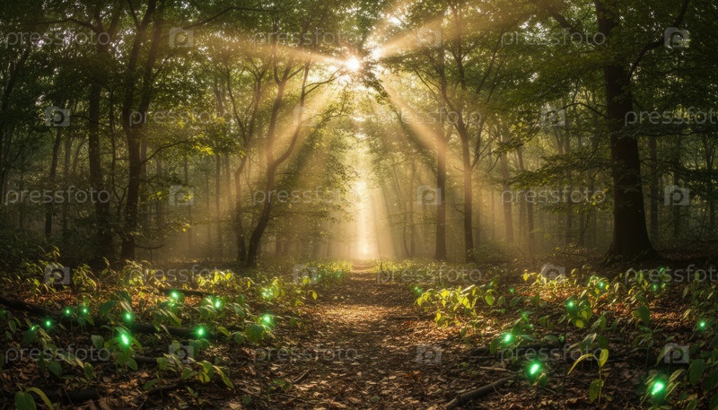 Солнечные лучи проникают через густые лесные навесы на лесной путь, освещенный светящимися зелеными светлячками в волшебной зачарованной утренней атмосфере