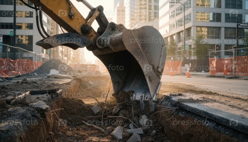 Бутерброд экскаватора копает глубокий траншею на оживленной улице города во время захода солнца для ремонта коммунальных услуг и развития городской инфраструктуры вблизи высоких зданий