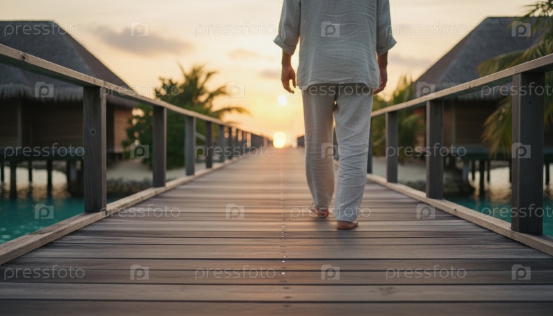 Человек, носящий льняные одежды, гуляет по деревянному пиру к тропическому закату на роскошном островном курорте с бунгалами и пальмами над водой
