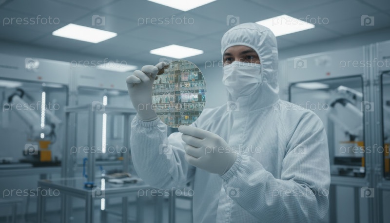 Инженер чистой комнаты осматривает кремниевую пластинку, представляющую передовой производственный точный научный прогресс и быстро развивающиеся глобальные технологические тенденции