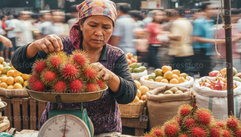 Азиатский продавец уличной еды взвешивает свежие красные фрукты Рамбутана на винтажных весах на оживленном открытом рынке с размытием движения