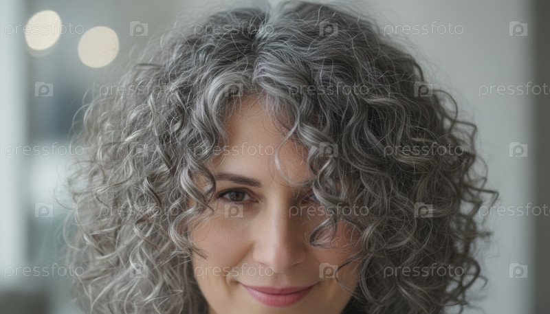 Близкий снимок серой кудрявой женщины, символизирующей индивидуальность естественная красота самовыражение уверенность и современный тренд образа жизни